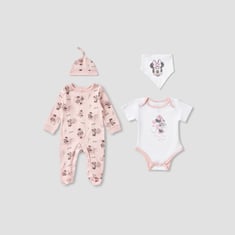 Dress your little one in this delightful four-piece baby clothing gift set, perfect for everyday adventures. This charming Minnie Mouse print set includes a sleepsuit, bodysuit, a beanie, and a bib. The bodysuit is designed with an envelope neckline and snap closures, allowing for effortless dressing and changing. Crafted from soft fabric, this complete set provides gentle comfort against your baby's skin, making it an ideal choice for daily wear or as a lovely newborn gift.