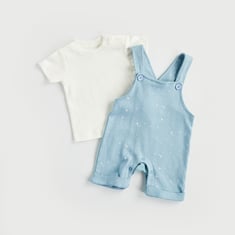 Sweet, simple, and endlessly charming, this dungaree set is designed for little moments that matter. The solid t-shirt features a classic crew neckline and short sleeves for everyday ease, layered with a printed dungaree that adds a playful touch. Adjustable straps and a relaxed silhouette make it ideal for comfort-filled days of crawling, exploring, and cuddles. Made from soft, breathable fabric that feels gentle and cosy on delicate skin.