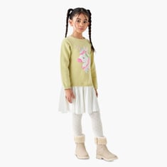 Juniors Unicorn Applique Sweater Dress with Polka Dot Tights