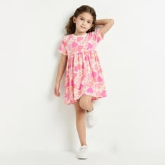 Sweeten her wardrobe with this heart print A‑line dress, featuring a round neck, half sleeves, and soft fabric for all‑day comfort with a playful touch.