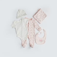 Dress your baby in style with this delightful five-piece floral print clothing set from Juniors. Featuring a range of versatile pieces, including a bodysuit, sleepsuit, blanket, bib and beanie. The soft material provides a gentle touch against your baby's skin, while the charming floral print adds a touch of sweetness to their everyday look. Perfect for both casual wear and special outings, this set is a must-have for your little fashionista.