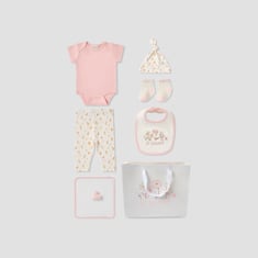 This seven-piece clothing set includes a bodysuit, leggings, bib, beanie, a pair of socks, blanket, and a gift bag. The soft, comfortable materials ensure gentle wear for your little one. The set features a charming floral print, perfect for everyday wear or special occasions. This complete set makes a thoughtful gift for newborns and infants.