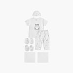 This clothing gift set includes a t-shirt, pants, cap, mittens and more. This set features a charming bear print, offering both comfort and style. This thoughtful gift set is perfect for newborns and infants and ensures a coordinated look for every occasion. The soft and breathable fabrics provide ultimate comfort for your little one.