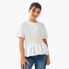 Introduce a touch of elegance to your daughter's casual wardrobe with this charming peplum top, beautifully designed with delicate floral embroidery. This short-sleeved top features a classic round neck and a stylish, textured hem, which creates a playful silhouette for comfortable movement. Crafted from soft, breathable fabric, this top ensures all-day comfort and is simple to care for.