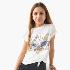Juniors Graphic Print T-shirt with Short Sleeves and Knot Detail