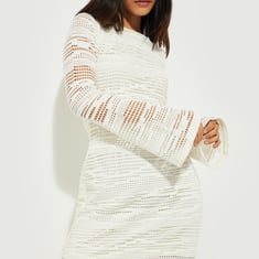This crochet straight dress features intricate crochet detailing, a lined interior for comfort, and a tie-up back for a customizable fit. The full sleeves and boat neck create a refined, elegant silhouette.