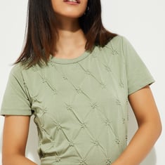 Add a touch of elegance to your wardrobe with this embroidered top. Featuring a classic round neck and half sleeves, the intricate embroidery adds a refined charm to its simple silhouette.