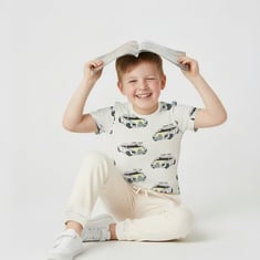 This printed T-shirt features a classic crew neck and half sleeves, offering all-day comfort with a fun all-over print that brightens up your little one's everyday style.