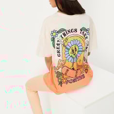 Prepare your little one for vacation adventures with this trendy oversized T-shirt. Featuring a stylish graphic print at the back and a subtle ombre surface, this T-shirt is both comfortable and chic. It comes with short sleeves and a round neck for ease of wear.