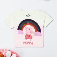Brighten her wardrobe with this charming T-shirt featuring a sequined Peppa Pig. With a classic round neck and half sleeves, it offers a comfortable fit, perfect for playdates or casual outings.