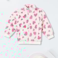 Warmth and whimsy make this jacket extra fun on chilly days. It is designed with a mock collar for extra warmth, cute heart prints for a playful touch, and handy waist pockets for storing little treasures. The fleece finish lends a cosy look.