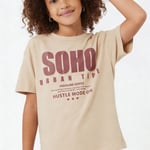A fun typographic print T‑shirt designed with a round neck and half sleeves, perfect for everyday comfort and playful style.