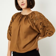 This solid top is the perfect mix of casual and chic, featuring peasant sleeves and a stylish tie-up neck. The cut-out detail on the sleeves adds a trendy twist to the classic design, making it your go-to for effortless style.