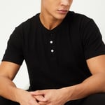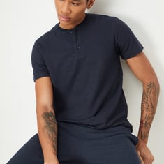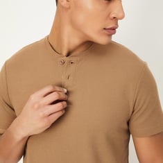 Look effortlessly stylish by wearing this T-shirt featuring a knit design. It has a Henley neck, half sleeves, and a three-button placket.