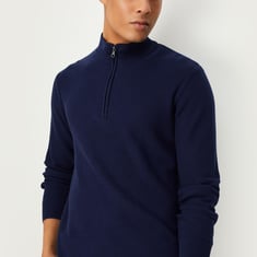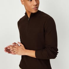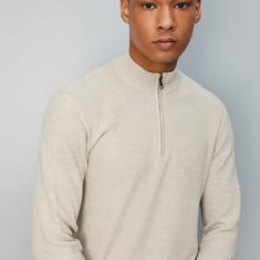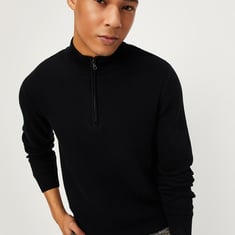 This sweater will keep you warm and toasty this winter. It features a mock collar, half zip placket, full sleeves, and ribbed trim. Complete the look by styling this sweater with jeans and sneakers.