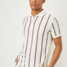 Elevate your casual style with this striped polo T-shirt. Featuring a classic polo collar, half sleeves, and a two-button placket, it combines refined comfort with timeless appeal.