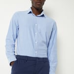 This formal striped shirt is tailored in a regular fit for timeless appeal. It features a spread collar, full cuffed sleeves, a button-down front, and a curved hem for a polished finish.