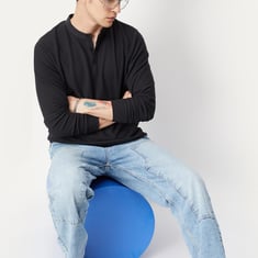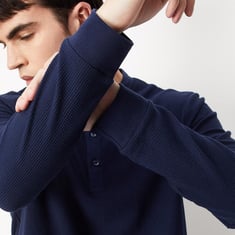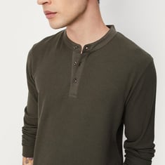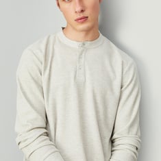 Elevate your casual fashion with this T-shirt that boasts a textured finish. The tee is crafted with a Henley neck and long sleeves for a comfortable fit. To achieve a perfect ensemble, combine this shirt with a pair of shorts and sneakers.