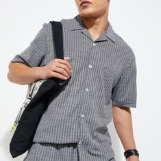 Level up your summer vibe with this herringbone-patterned shirt, featuring a resort collar and short sleeves. Ideal for urban adventures, it infuses a laid-back sophistication into your street style.