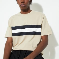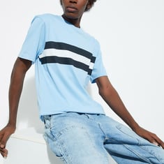 Infuse comfort and style into your wardrobe with this T-shirt featuring a trendy striped pattern, half sleeves, and a classic crew neck.