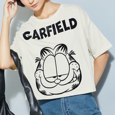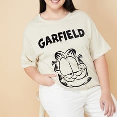 Bring playful energy to your wardrobe with this Garfield boxy fit T-shirt, featuring a round neck and half sleeves. Designed for comfort and character, it's perfect for casual, laid-back days. Model Size :