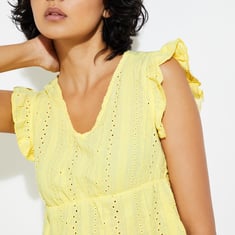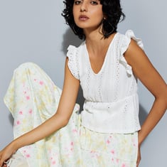 Step into urban summer style with this elegant blouse, elevated by intricate schiffli embroidery. With its round neckline, flutter sleeves, and trendy peplum hem, it's the perfect blend of sophistication and street style.