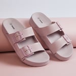 Step out in style with these dual strap flats featuring bold buckle details. Designed for easy slip-on comfort with a modern edge.