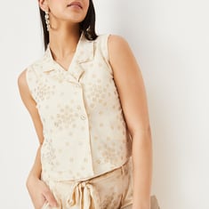 A perfect mix of ethnic and contemporary styles, this crop top is sure to make heads turn. It has a notched collar, sleeveless construction, front double button placket, embellished detailing, and a crop profile. Style this top with a pair of trousers and block heels for an elevated look.