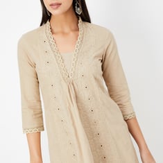 This embroidered A-line kurta features intricate designs, a flattering V-neck, and 3/4th sleeves for a perfect blend of comfort and elegance. The side pockets add a practical touch, making it both stylish and functional.