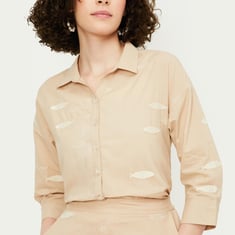Skip into summer in style in this shirt. It is updated with fish embroidery all over. It is fashioned with a collared neck, three-quarter sleeves with buttoned cuffs, and a high-low hem.