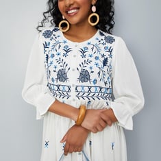 Elevate your fashion game with this beautiful boho dress, expressing your distinctive style. Designed with a round neck, full-length button placket, embroidered yoke, and puffed sleeves, it seamlessly blends comfort with a touch of glamour. The midi-length silhouette makes it versatile for various occasions