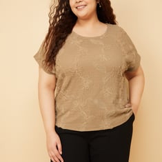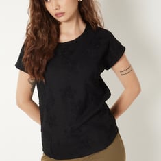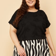 This patterned top features a classic round neck and half sleeves, offering a clean, modern silhouette with subtle depth. Its soft texture elevates everyday dressing, making it an easy staple for both work and casual looks. Model Size :