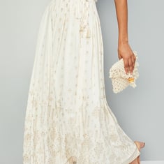 This floral-printed skirt is a whimsical wardrobe essential, offering a playful and feminine touch with its swirling patterns and flattering silhouette. It has a partially elasticated waistband, a side-button closure, and a heavy flare with tassels. This skirt is a graceful and charming ensemble perfect for casual and semi-formal occasions.