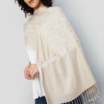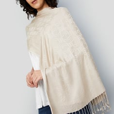 Elevate any outfit with this stunning scarf, crafted with a tonal jacquard pattern that exudes elegance. The exquisite design is complemented by a charming tassel trim, adding a delightful boho touch.