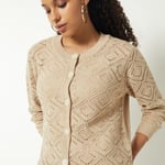 Classic and cozy, this cable knit cardigan features a round neck, full sleeves, and a front button placket. The textured knit adds warmth and charm, making it a layering essential for cooler days.