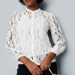Enhance your attire with this elegant blouse, featuring a band collar with pin tuck detailing, a lace bodice, full sleeves, and a button-up front. It also includes a coordinating camisole to complete the sophisticated look.