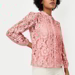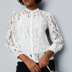 Enhance your attire with this elegant blouse, featuring a band collar with pin tuck detailing, a lace bodice, full sleeves, and a button-up front. It also includes a coordinating camisole to complete the sophisticated look.