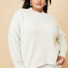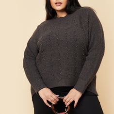 Dress for the season in style with this sweater, adorned with pearl embellishments for an elegant touch. It features a round neckline, full sleeves, and a chic high-low hem, adding a modern twist to your winter wardrobe.