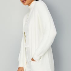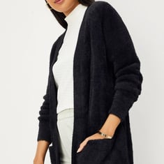 Complete your winter outfit with a solid plush yarn shrug featuring an open front, full sleeves, and waist pockets. Pair it with a tee and trousers to achieve the perfect look.