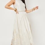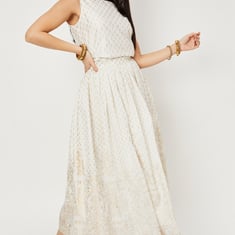 Step into the festive season in style in this breezy skirt. It has all-over prints, a partially elasticated waist with a side button closure, gathered detailing, and a maxi-length profile. Pair this skirt with a matching top and block heels for an elevated look.