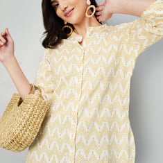 Immerse yourself in this printed kurti featuring chevron print, band collar, and three-quarter sleeves with curved hem.This kurti gives you the perfect casual yet ethnic vibe of your imagination.