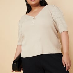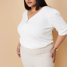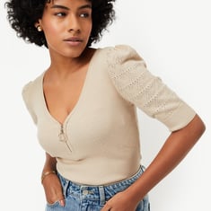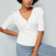Build your basic wardrobe with this top, featuring a rib-knit design and a v-neckline with a zip closure. Its puffed half sleeves add a touch of sophistication, making it a versatile and stylish addition to your collection.