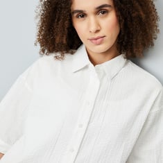 Elevate your wardrobe with this cropped shirt, designed with a spread collar and half sleeves for a touch of elegance. The lightweight seersucker fabric and trendy cropped silhouette make it a perfect choice for casual outings or warm-weather styling.