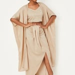 Add a fusion of elegance and flair to your look with this shimmer shrug. The front-open design, kimono sleeves, and calf-length silhouette create a graceful flow, blending contemporary style with classic charm for a versatile layering piece suitable for any occasion.