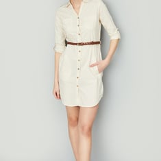 Slay your day in style in this tunic rendered in a solid tone. It features a spread collar, full sleeves with roll tabs, a belted waist, patch pockets on the chest, waist pockets, and a curved hem.