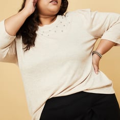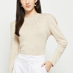 Make a style quotient with this knitted top designed with stone embellishments, round neckline, and full sleeves.