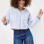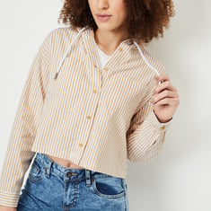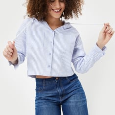 Elevate your fashion game with this striped seersucker shirt, designed to make a statement. Featuring a trendy cropped silhouette, hooded neckline, full sleeves with buttoned cuffs, and two patch pockets, it effortlessly combines style and functionality.