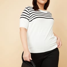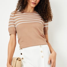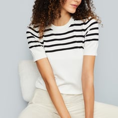 Stay cosy with this top. The knit construction with a striped pattern lends a cosy look. It has a round neck, half sleeves, and ribbed trim. Model Size :