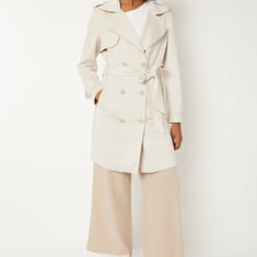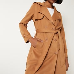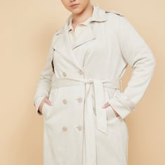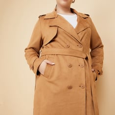 Elevate your outerwear collection with this textured suede trench coat, featuring a classic lapel collar, button closure, full sleeves, and functional pockets. The waist tie-up adds a flattering, adjustable fit for a timeless silhouette. Model Size :