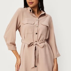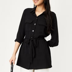 This textured tunic will help you conquer your day in elegance. It has a tie-up belt at the waist, a spread collar, three-quarter sleeves, patch pockets on the chest, and a curved hem. To rock the style, wear this tunic with sneakers.